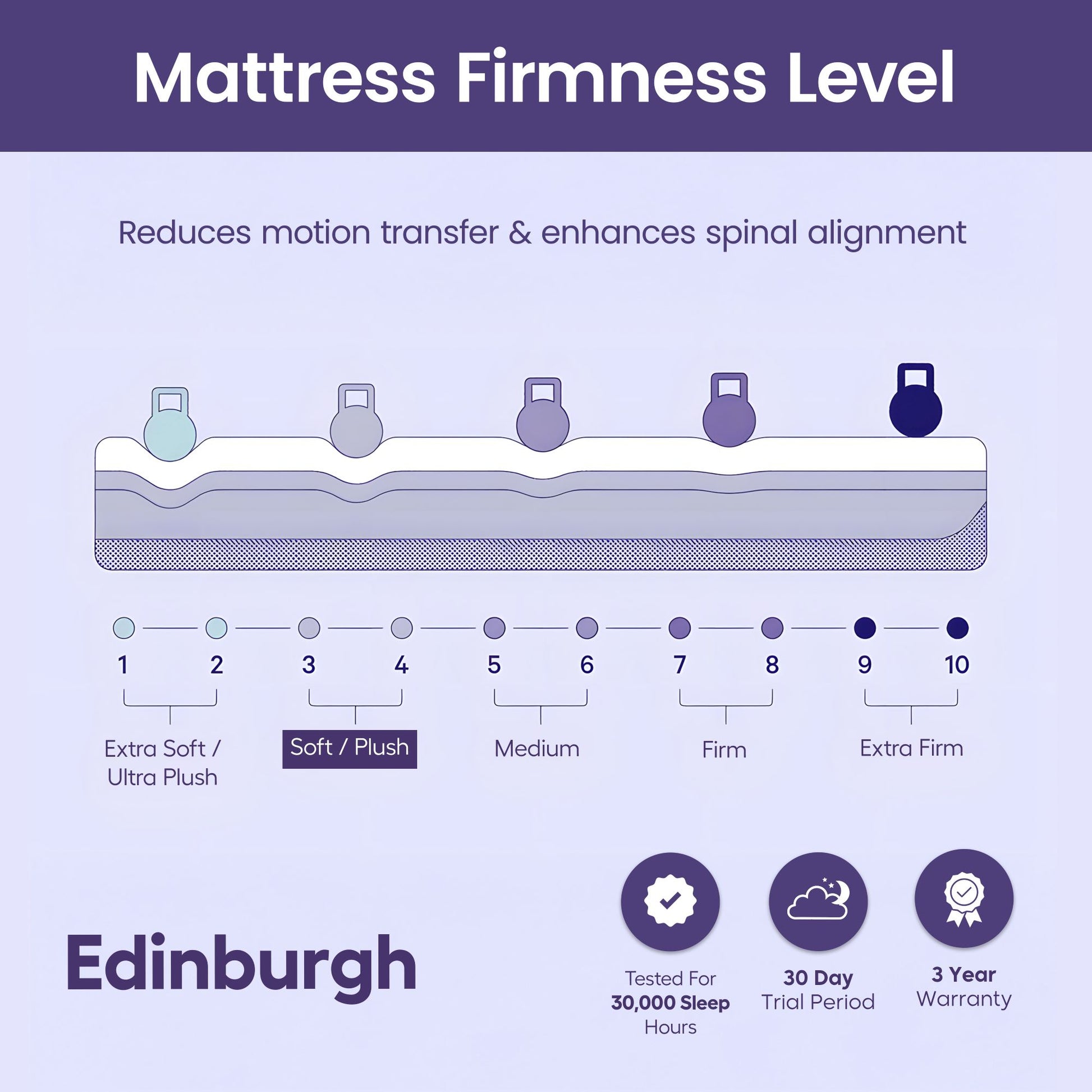 The pocket springs work independently to minimize motion transfer, making this mattress ideal for couples who want undisturbed rest. Its memory foam layer adapts to your body’s contours for added comfort, while the no-turn design ensures easy maintenance and long-lasting durability. With the perfect balance of support, comfort, and breathability, the Edinburgh Mattress is designed to deliver consistent, luxurious sleep night after night.
