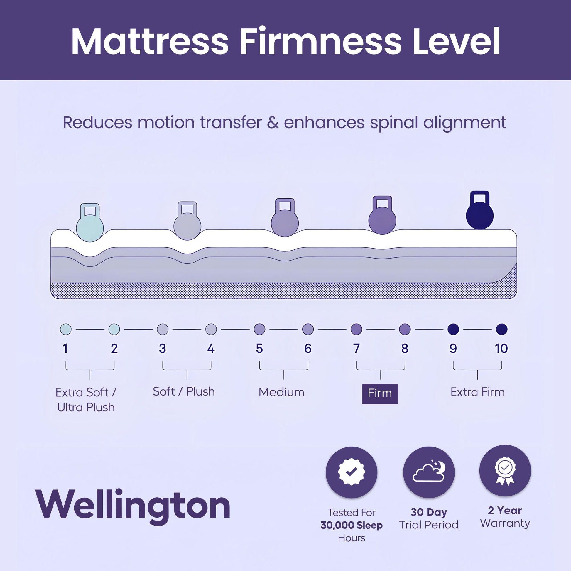The Wellington Medium Firm Mattress is expertly crafted to provide the perfect balance of support and comfort, making it ideal for all sleeping positions—back, side, or stomach. Its innovative 3-zone pocket spring system delivers targeted support to your head, lumbar, and legs, promoting proper spinal alignment and reducing pressure on sensitive areas for a restful, rejuvenating sleep experience. The medium-firm feel combines contouring comfort with reliable support, while individually wrapped pocket springs minimize motion transfer, ensuring undisturbed rest for couples.